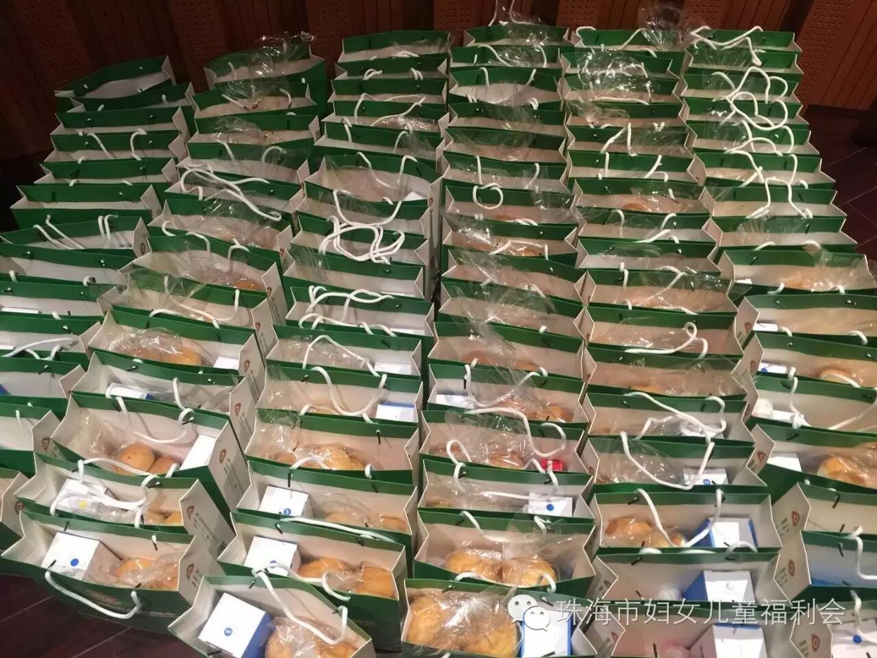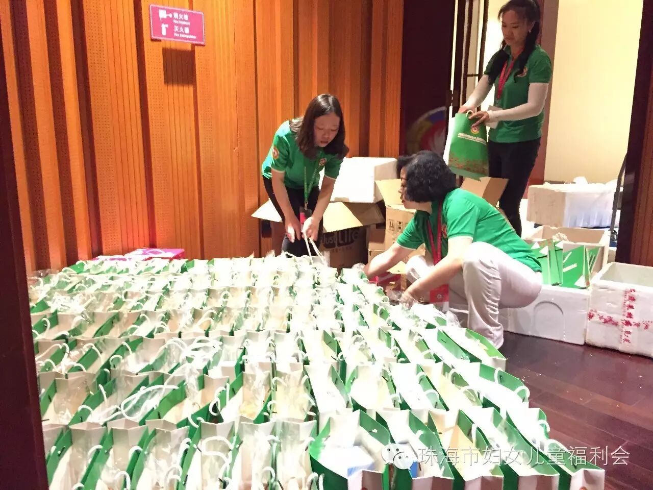 福利会工作人员很早就赶到活动现场,为当晚活动分装礼品,现场布置。