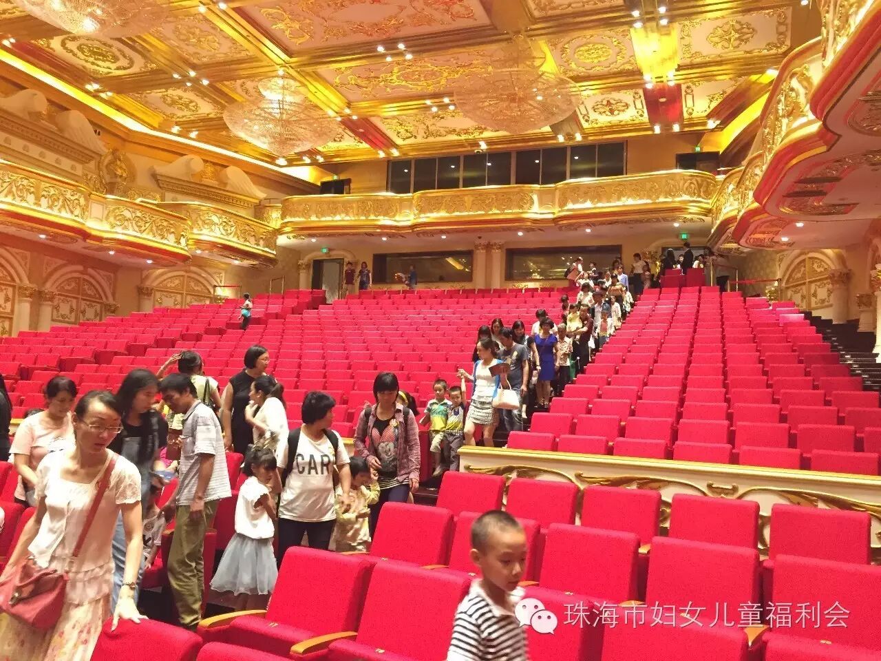 自助晚餐过后,在工作人员的带领和指引下,大家步行前往华发中演大剧院,华发中演大剧院的工作人员对大家的到来表示了热烈的欢迎,安排合影后,井然有序的带领大家参观大剧院。当来到富丽堂皇的音乐厅时,孩子们都惊呆了,一双双大眼睛被璀璨华丽的装饰,格局高雅的舞台风格深深吸引,并认真的聆听带队哥哥的讲解,大家齐坐红色座椅,共同举起爱的双手,为了这份邀约,用镜头留下这些美好。