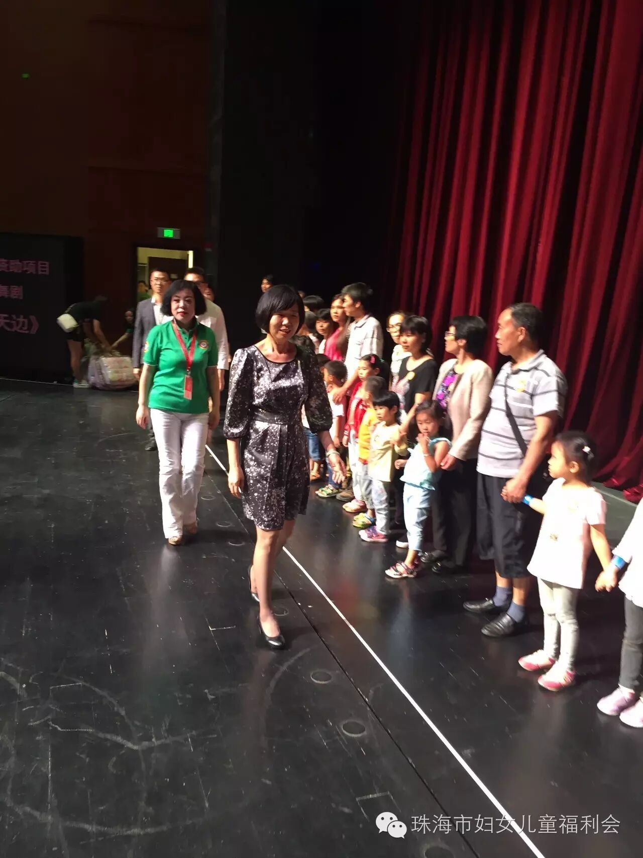 最后,大家来到今晚观看演出的剧院厅,安排入座后,由珠海华发大剧院主持 人天恒哥哥,为大家介绍此次活动的主题、背景及意义,并将到场的所有小天使宝贝及康乃馨妈妈们请到台前,珠海市妇女联合会调研员胡约雅,珠海市妇女儿童福利会会长陈伟光、珠海广播电视台生活频道总经理扶志新,珠海市华发大剧院副总经理朱婧以及福利会爱心会员们,共同为他们送上节日的礼物,并合影留念。随着美妙的音乐声响起,演出正式开始,惊艳世界的民族风情——壮族民族舞剧《妈勒访天边》正式开始,《妈勒访天边》以民间传说为基础,讲述了妈勒(壮语:母子)不畏艰险到天边寻访太阳的故事。是一部非常值得全家共赏的亲情大戏。