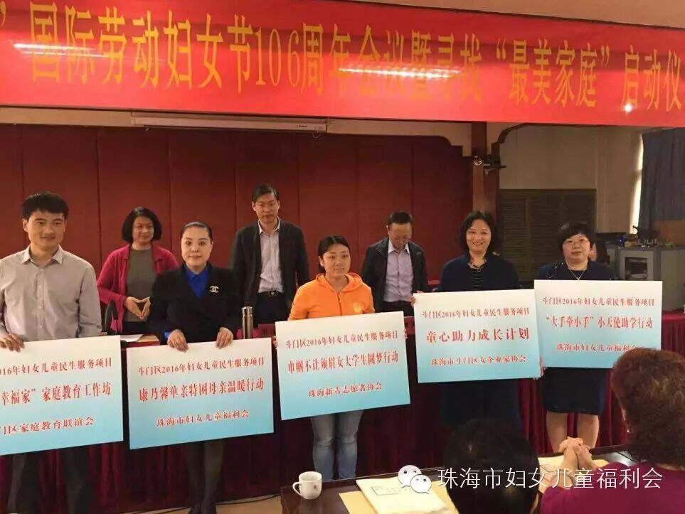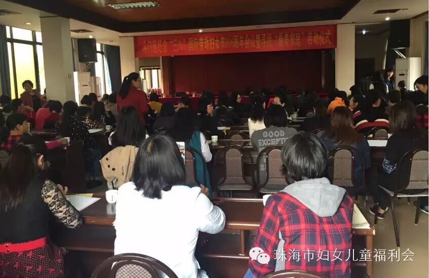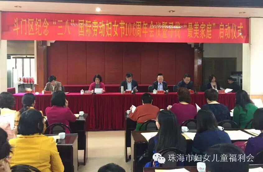 今天上午09:30,斗门区纪念“三八”国际劳动妇女节106周年会议暨寻找“最美家庭”启动仪式,在斗门区市政府隆重召开,斗门区区长周海金等区领导参加会议;妇联兼职副主席、执委,2015年获省和市先进的集体、个人,文明岗代表,企业界妇女,高端女性人才、巾帼女能手;各园区管委会、区直行政事业单位、区各人民团体妇委会主任近150人参加。我会会长陈伟光、副会长欧阳彦代表福利会出席。