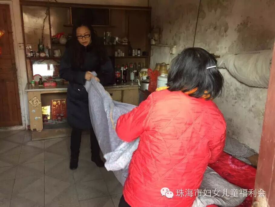 1月25日下午,市妇联副主席刘敬华及市妇女儿童福利会会长陈伟光等一行8人,来到斗门区白蕉镇泗喜村,走村串户,亲切慰问7位已有90多岁高龄的老人,为她们送去棉被、棉鞋、棉裤、保暖内衣、帽子、围巾等多样慰问品,每份价值近500元,在新春佳节到来之际,将寒冬的关爱送到他们的心坎上,进一步弘扬中华民族尊老、助老的传统美德。