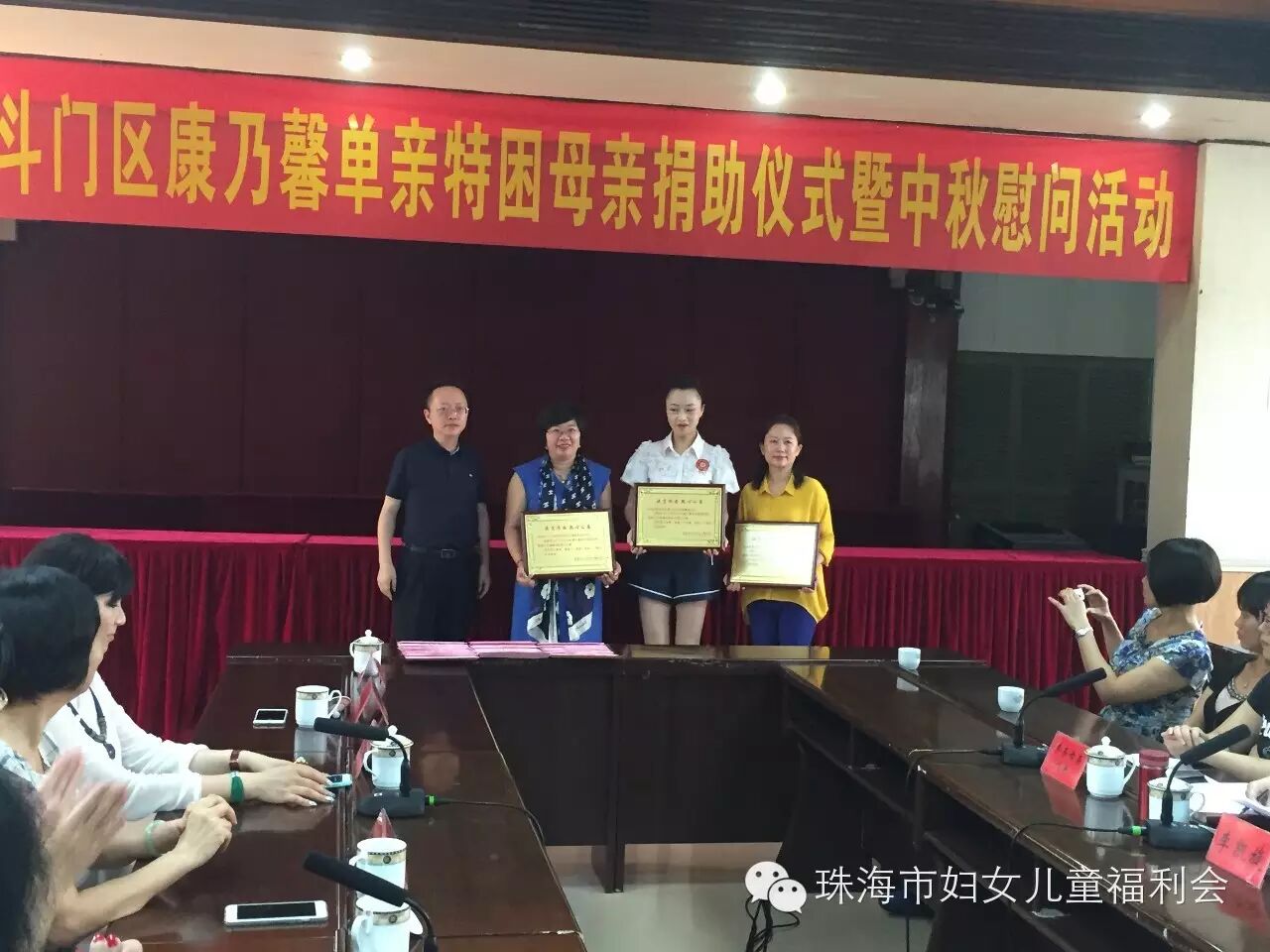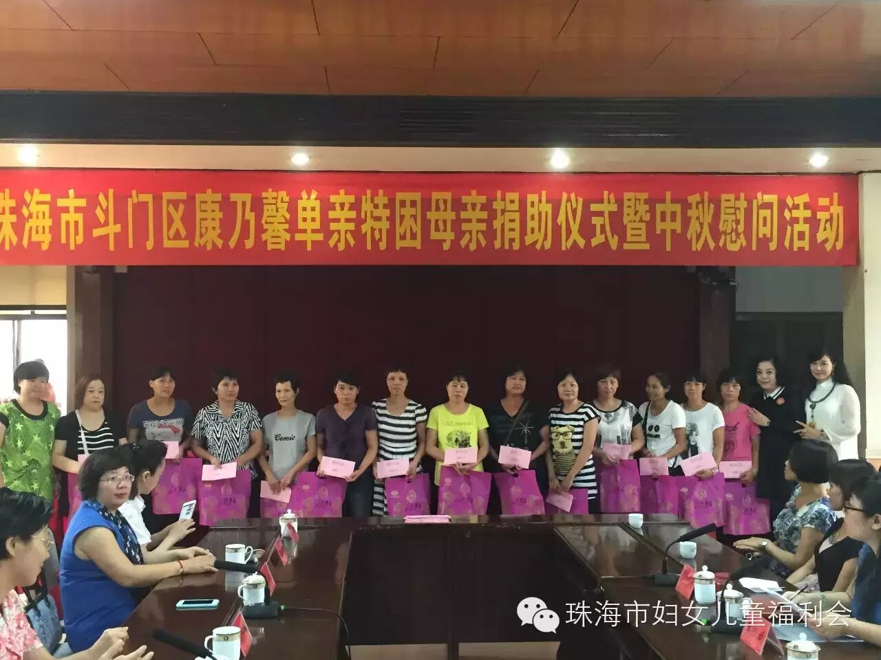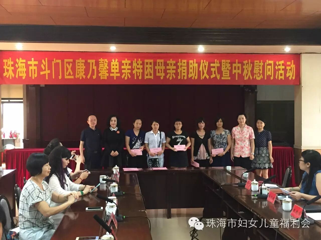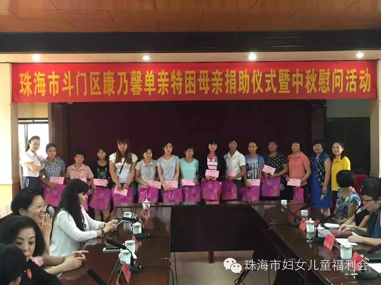 9月24日上午10:00, 以“与你牵手 温暖同行"为主题的斗门区2015年康乃馨单亲特困母亲捐助仪式暨中秋慰问活动,在斗门区人民政府2号会议室举行。市妇联主席玄阳、调研员胡约雅、会长陈伟光及我会会员、斗门区委常委、组织部部长王建灵一行到场参加。活动现场,我会会长陈伟光做为珠海市妇女儿童福利会代表,为斗门区妇联捐赠36.6万元支票,在场领导分别为我会会员颁赠荣誉牌匾,感谢我会为康乃馨单亲特困母亲活动的支持与贡献。会长陈伟光表示,康乃馨特困单亲母亲温暖行动开展了两年,80%的帮扶对象在斗门区,看到被帮扶的单亲母亲,面对生活乐观积极、充满自信,我们倍感欣慰,妈妈们不仅要承担照顾整个家庭的责任,还要积极的投入到工作当中,希望每个妈妈都能够坚强的面对生活所带给我们的压力,快乐生活。最后,由我会会员共同为斗门区30位单亲特困母亲发放慰问金38000元及慰问品,祝福她们度过一个愉快的中秋佳节!
