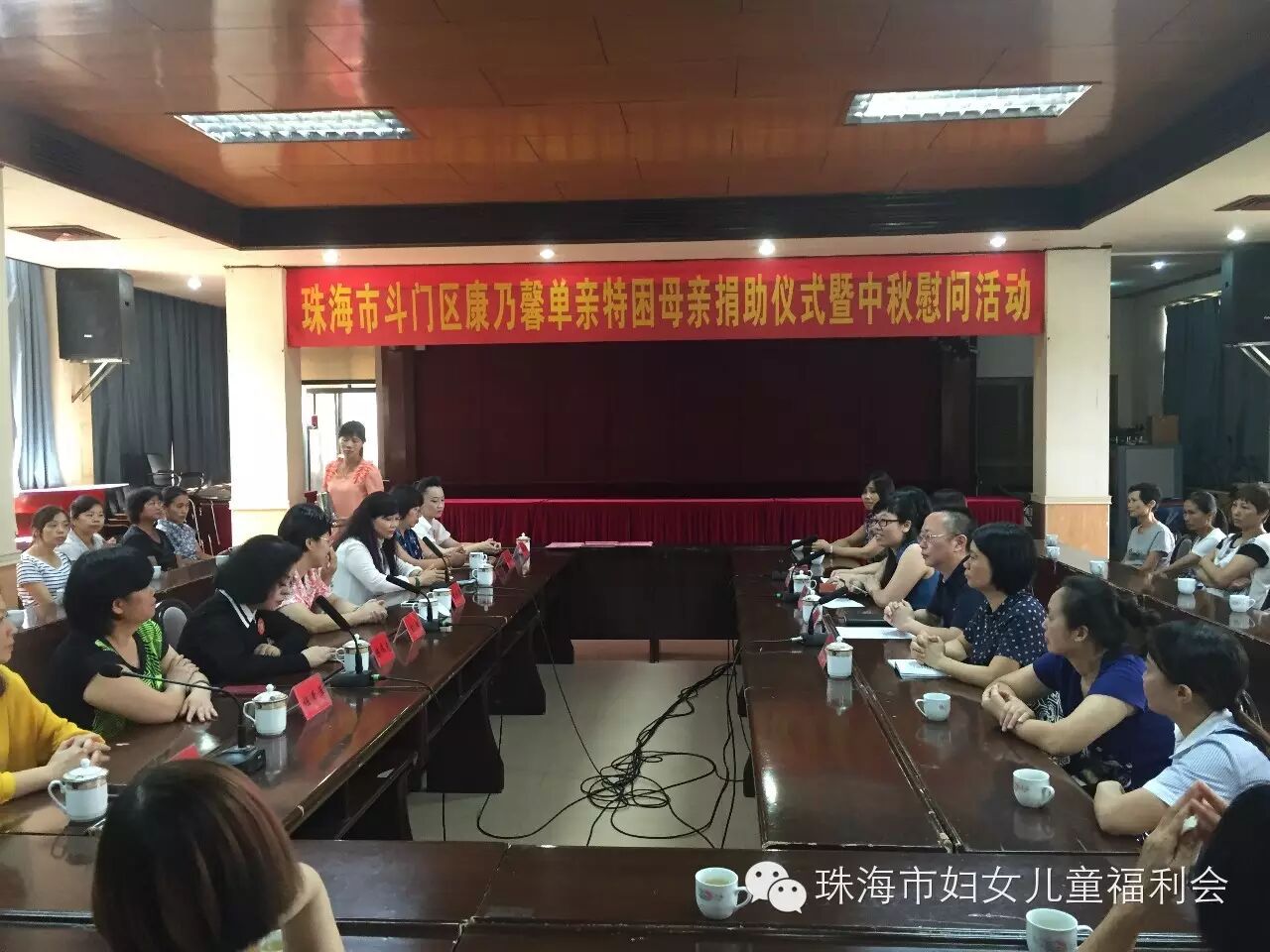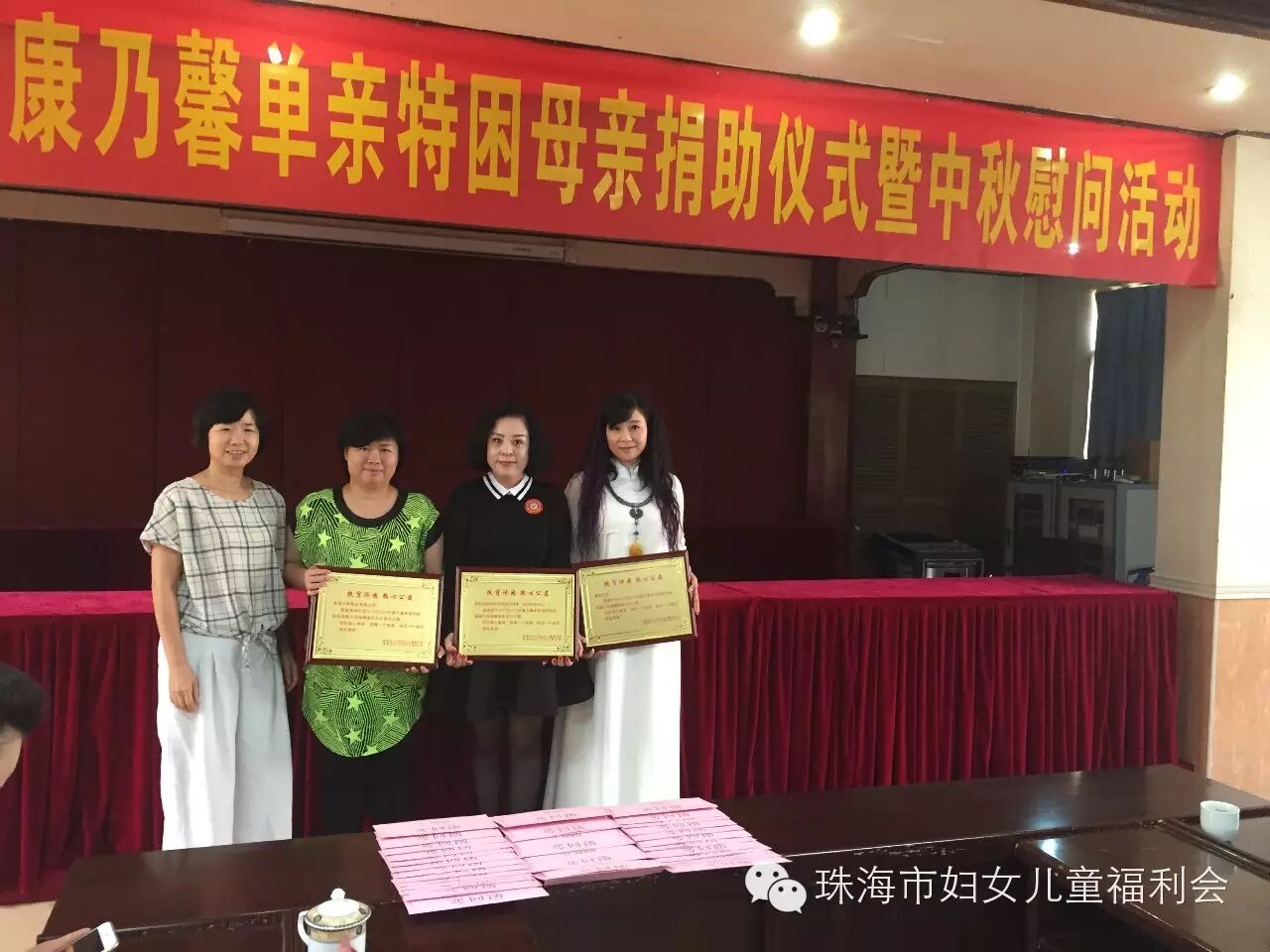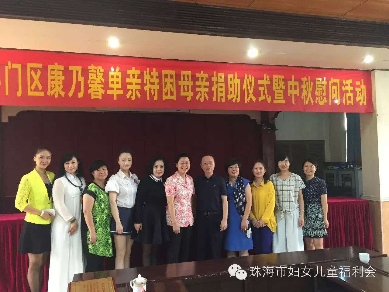 9月24日上午10:00, 以“与你牵手 温暖同行"为主题的斗门区2015年康乃馨单亲特困母亲捐助仪式暨中秋慰问活动,在斗门区人民政府2号会议室举行。市妇联主席玄阳、调研员胡约雅、会长陈伟光及我会会员、斗门区委常委、组织部部长王建灵一行到场参加。活动现场,我会会长陈伟光做为珠海市妇女儿童福利会代表,为斗门区妇联捐赠36.6万元支票,在场领导分别为我会会员颁赠荣誉牌匾,感谢我会为康乃馨单亲特困母亲活动的支持与贡献。会长陈伟光表示,康乃馨特困单亲母亲温暖行动开展了两年,80%的帮扶对象在斗门区,看到被帮扶的单亲母亲,面对生活乐观积极、充满自信,我们倍感欣慰,妈妈们不仅要承担照顾整个家庭的责任,还要积极的投入到工作当中,希望每个妈妈都能够坚强的面对生活所带给我们的压力,快乐生活。最后,由我会会员共同为斗门区30位单亲特困母亲发放慰问金38000元及慰问品,祝福她们度过一个愉快的中秋佳节!